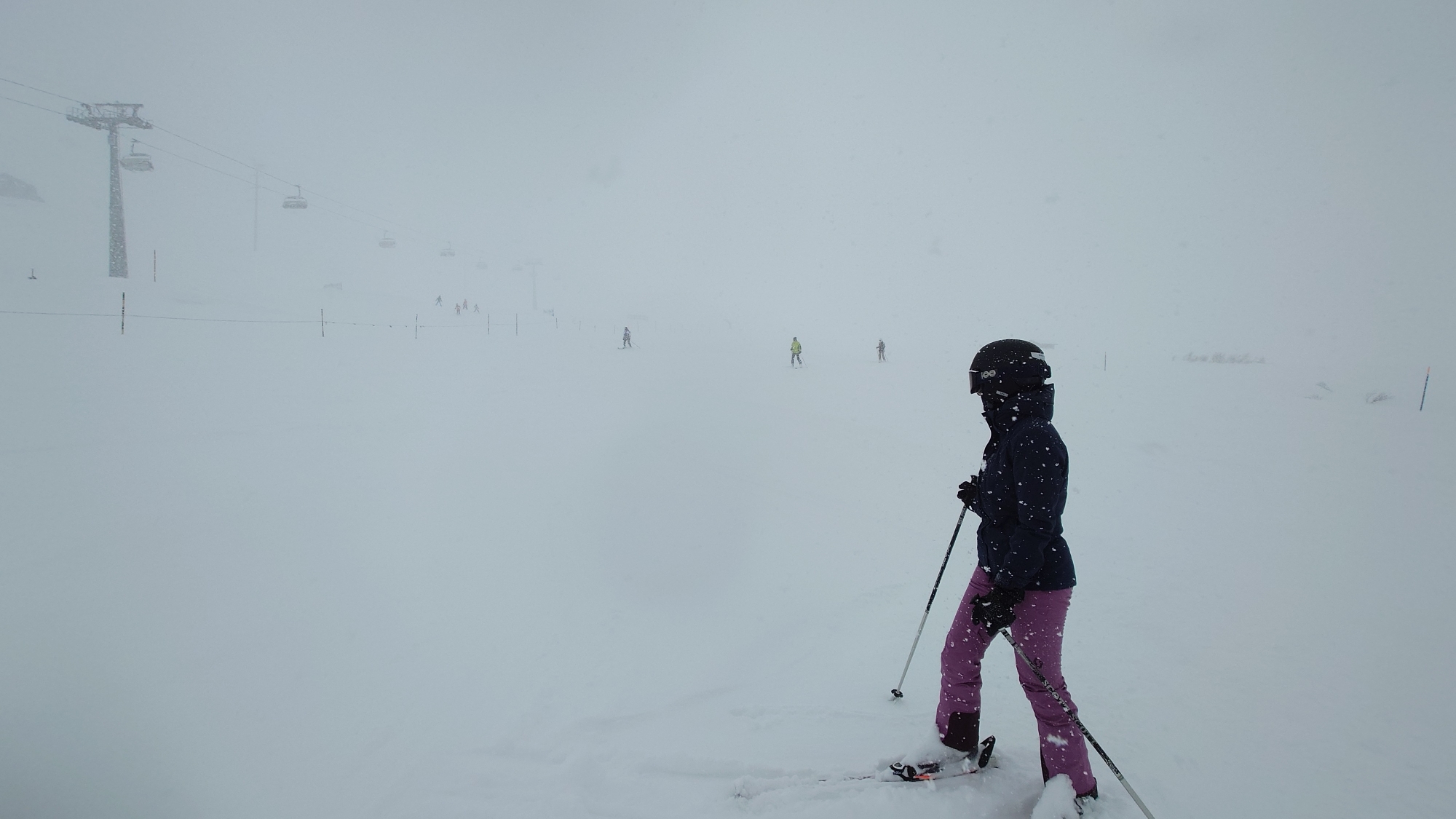Die Sicht auf den Pisten war aufgrund des anhaltenden Schneetreibens zwar nicht ideal, dafür sorgte der frische Pulverschnee für ein echtes Winterabenteuer. Trotz der eingeschränkten Sichtverhältnisse genossen wir die Abfahrten und die besondere Stimmung in der verschneiten Bergwelt.